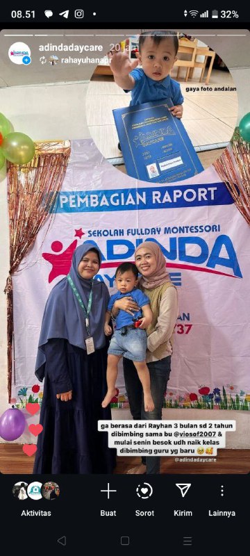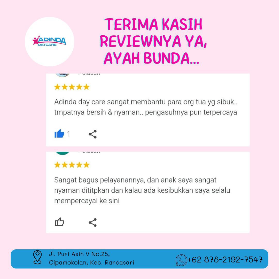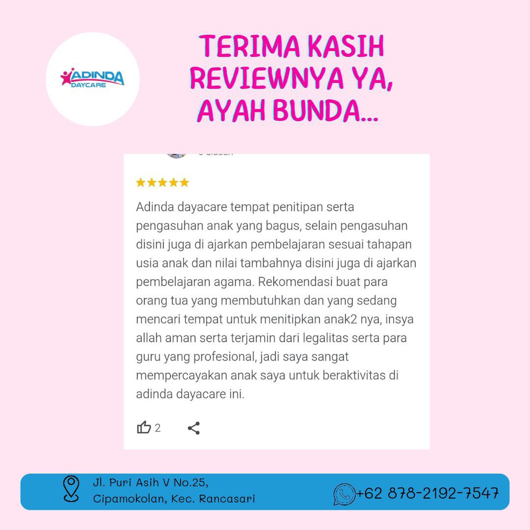 “Di Adinda Daycare, bukan hanya pengasuhan yang Anda dapatkan—tapi fondasi pendidikan yang kokoh, aman, dan penuh cinta. Inilah tempat di mana anak Anda bukan hanya ‘dititipkan’, tapi juga tumbuh menjadi pribadi mandiri, kreatif, dan penuh percaya diri.”